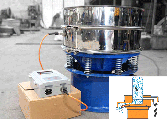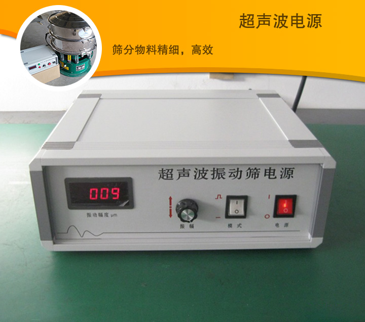 超聲波諧振電源產(chǎn)生的高頻電振蕩由振蕩器轉(zhuǎn)換成高頻正弦形式的縱向振蕩波,這些振蕩波傳到共振環(huán)上使共振環(huán)產(chǎn)生共振,然后由共振環(huán)將振動(dòng)均勻傳輸至篩面。附加在篩網(wǎng)上的超聲振動(dòng)波(機(jī)械波),使超微細(xì)粉體接受巨大的超聲加速度,從而壓制粘附、摩擦、平降、楔入等堵網(wǎng)因素,提高篩分效率和清網(wǎng)效率。