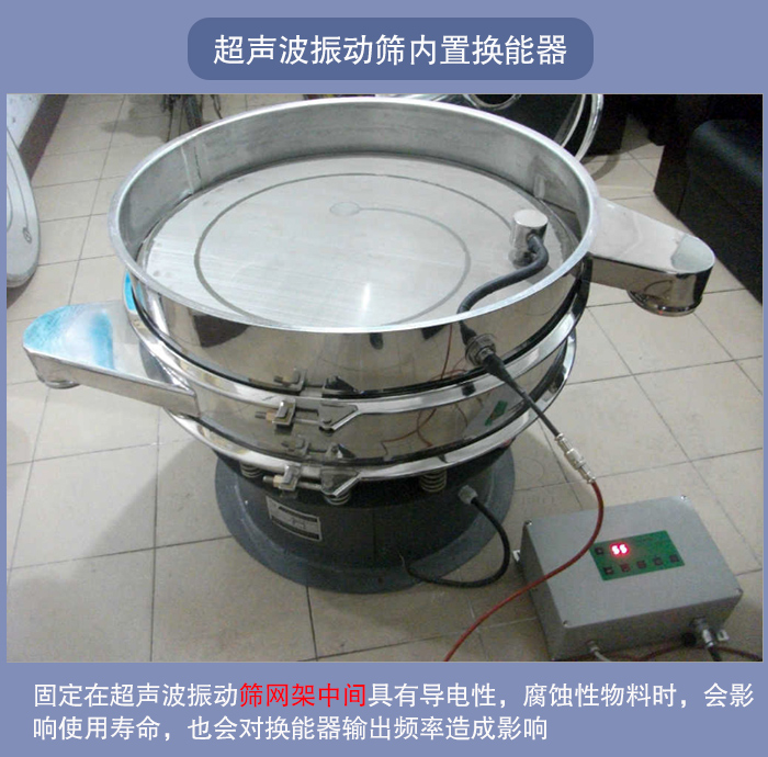 一般直接固定在超聲波振動篩網架中間,在使用過程中與篩分物料會有接觸的部分,所以在篩分一些具有導電性,腐蝕性物料時,會影響使用壽命,也會對換能器輸出頻率造成影響,從而降低了篩分精度與產量。但是價格相比較外置換能器便宜不少。